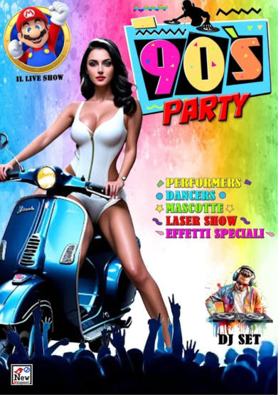 Con "90'S Party" basta chiudere gli occhi, lasciarsi trasportare dalla musica, farsi guidare dall'animazione e, come per magia, ci troveremo catapultati, per una una pazza e nostalgica serata, nelle notti magiche e intramontabili degli anni '90!